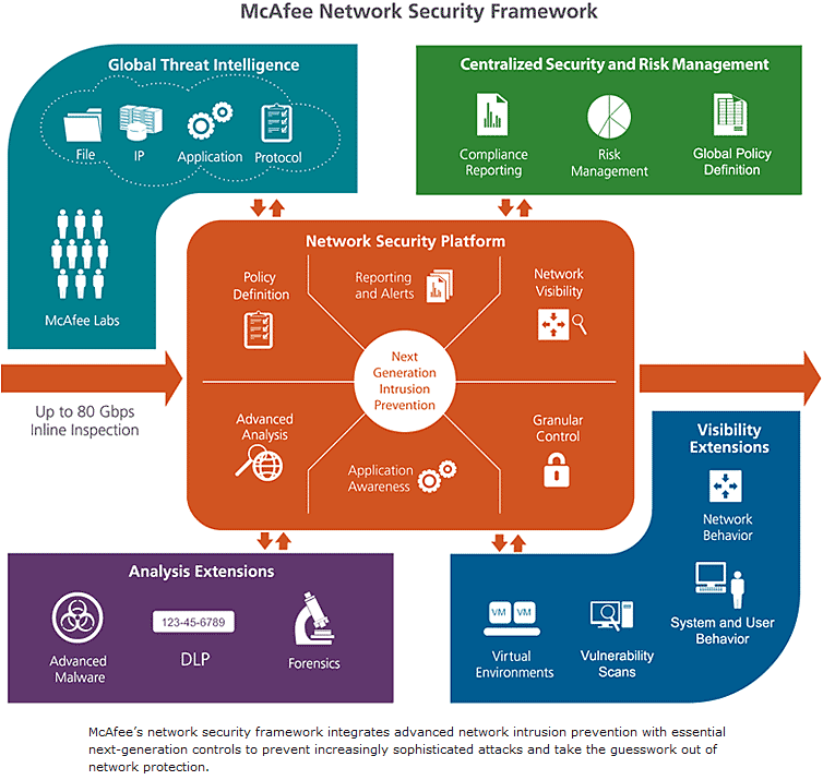 使用 Network Security Platform,您得到的是實體和虛擬環境的整合式網路安全解決方案,可簡化安全作業及保護您的企業抵禦最新的惡意軟體、零時差攻擊、殭屍網路 (Botnet)、阻絕服務 (DoS) 嘗試和進階鎖定攻擊。它可讓您利用預測的威脅情報、應用程式可見性與控制、網路行為分析和即時威脅感知來控制網路。