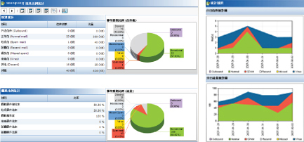 SAPM SQR 提供最多樣、精緻、實用的報表,如:首頁系統狀況一覽表、流量統計、攔截狀況統計、郵件分類統計、人員排名、寄件者來源統計、IP來源統計、重寄郵件統計、阻擋統計、連線錯誤統計、病毒分類統計..等多類報表,同時提供報表匯出及列印的功能,讓您更能掌握SPAM SQR的運作及電子郵件系統運作情況。